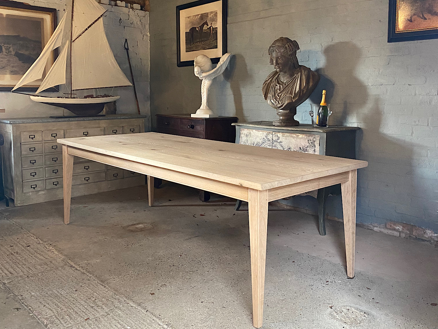 A classic Country House design. Hand made - understated. This attractive table features a long boarded top over a solid frieze supported by four square tapering legs. The base featuring a decorative cock bead to the legs and frieze. A great fit for period or contemporary settings alike.